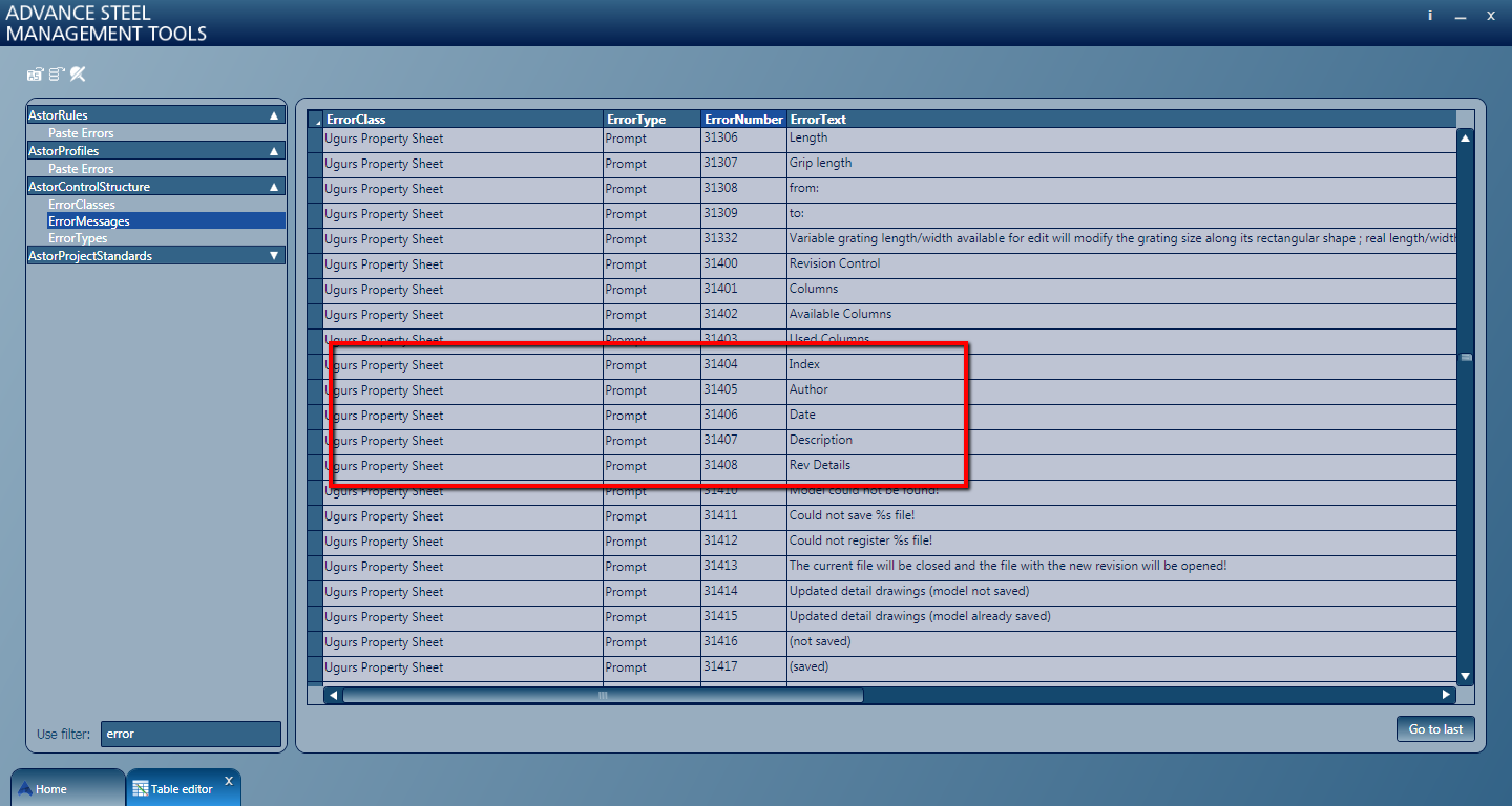 A work around to this is to change the message in Advance Steel. Locate the error messages in Advance Steel Management tool and change the ErrorText column.